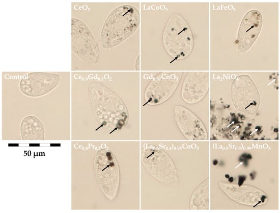 Viable protozoa T. thermophila exposed to 100 mg/L of various REOs for 24 h. Black arrows indicate food vacuoles filled with agglomerated REO particles, white arrows indicate particle-agglomerates released to the environment.