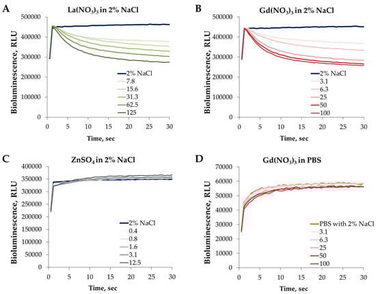 Kinetics of the Vibrio fischeri bioluminescence inhibition by La3+(A), Gd3+ (B,D), and Zn2+ (C) in 2% NaCl (A–C) and phosphate-buffered saline (PBS) containing 2% NaCl (D). Bacteria were exposed to different dilutions of soluble salts of Gd3+ and La3+ (rare earth elements), and Zn2+ and luminescence was followed during first 30 s of the contact with chemicals. Tested nominal concentrations (mg metal/L) are shown in the inset.