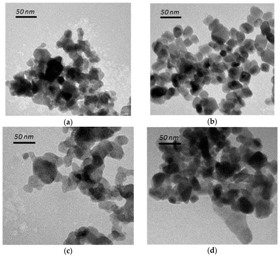 TEM images of (a) anatase spheroidal TiO2; (b) anatase cubic TiO2; (c) rutile spheroidal TiO2; and (d) rutile cubic TiO2.