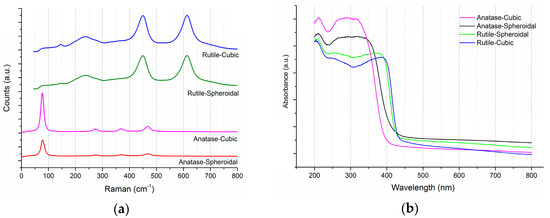 Raman and UV-VIS spectra of anatase and rutile TiO2 in both (a) cubic, and (b) spheroidal shapes. a.u.: arbitrary unit.