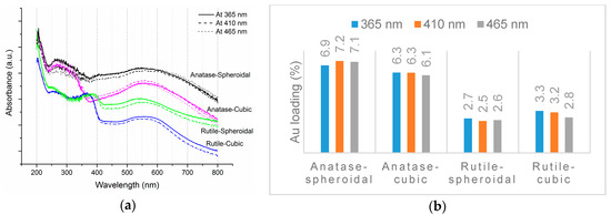 As revealed by TEM images in Figure 3a,b, Au was evenly distributed on the anatase TiO2. Under illumination wavelengths of 365, 410, and 465 nm, the average sizes of the Au particles deposited on anatase spheroidal TiO2 were 3.2, 2.8 and 3.0 nm respectively; and those on anatase cubic TiO2 were 3.5, 3.6, 3.6 nm respectively. Au deposited on the rutile TiO2 supports, on the other hand, appeared to be uneven and agglomerating. The average Au particle sizes under illumination wavelengths of 365, 410 and 465 nm were respectively 4.9, 5.3 and 5.1 nm when deposited on rutile spheroidal TiO2, and 4.8, 4.9 and 5.2 nm when deposited on rutile cubic TiO2. As shown in Figure 4a, UV-VIS spectra display the presence of a broad peak at 550 nm for all Au catalysts, which could be ascribed to the local surface plasmon resonance (LSPR) [33,34] as a signature of the presence of Au0 [35,36]. Comparing the UV-VIS spectra of anatase and rutile TiO2 supports, anatase TiO2 resulted in higher LSPR peaks compared to rutile TiO2. As verified by electron probe micro-analysis (EPMA) in Figure 4b, the higher LSPR peak could be induced by the higher Au content. It is postulated that the higher gold loading and better gold dispersion on anatase TiO2 than rutile TiO2 could be due to the difference in the surface and textural properties [37], in which, as compiled in Table 1 and Figure 5, supports with higher surface areas and bigger pore volumes such as anatase TiO2 having specific surface areas of 58.6–87 m2/g, allowed better gold deposition and dispersion (smaller Au particle size and higher Au loading), in contrast to rutile TiO2 having much smaller specific surface areas in the range of 0.53–0.98 m2/g.