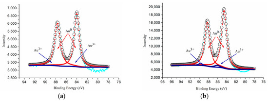 Table 1 compiles the results of X-ray photoelectron spectroscopy (XPS), Brunauer, Emmett and Teller (BET), CO oxidation activity and CO conversion results of different catalysts. Among all, anatase spheroidal TiO2 support having highest specific surface area (87.1 m2/g) enabled highest gold loading (7.2%) and catalyst specific surface area (114.4 m2/g) which then enabled comparatively highest CO oxidation activity (61.7 × 10−3 mmol CO/s.gAu). As shown in Figure 6, the as-prepared Au-TiO2 catalysts contained only two gold states—Au0 and Au3+. The binding energies of Au0 (4f5/2), Au0 (4f7/2), Au3+ (4f5/2) and Au3+ (4f7/2) were respectively 86.8, 83.3, 88.4 and 84.8 eV.