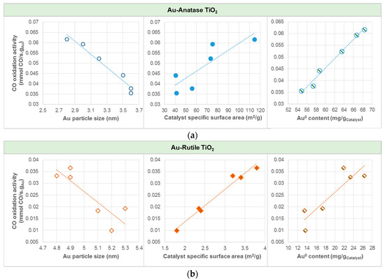 Effects of Au particle size, catalyst specific surface area, and Au0 content on CO oxidation activity for (a) Au-Anatase TiO2, and (b) Au-Rutile TiO2. Note: Au0 content in mg/gCatalyst was calculated by the total amount of catalyst multiplied by the gold loading and the Au0 atomic percentage.