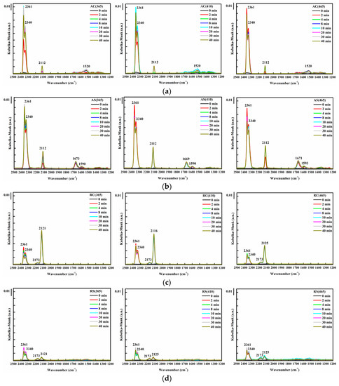 As seen in Figure 8a,b, for both cubic and spheroidal anatase TiO2-supported Au, approximately two minutes after feeding with CO, absorption peaks at 2112, 2340 and 2361 cm−1 appeared simultaneously. The former indicates adsorption of CO on Au0 [38,43], or more precisely, CO chemisorbed on the steps of small metallic Au particles [44], and the latter doublet indicates the formation of CO2 due to CO oxidation [44]. The byproduct formed was mainly monodentate carbonates (1520 cm−1) [45], bidentate carbonates (1669 cm−1) [46], and formates (1590 cm−1) [47]. The DRIFTS spectra of CO oxidation on rutile TiO2-supported Au catalysts on the other hand, revealed the noteworthy difference than those on anatase TiO2-supported Au catalysts. As shown in Figure 8c, two minutes after feeding with CO, unlike Au supported on anatase TiO2, no absorption peak at 2112 cm−1 was observed (which could also be overlapped); instead, the absorption peak at 2121 cm−1 appeared for RC(365) and RS(365); 2116 cm−1 for RC(410); and 2125 cm−1 for RC(465), RS(410) and RS(465), with the CO2 signals relatively smaller than anatase TiO2-supported Au catalysts.
