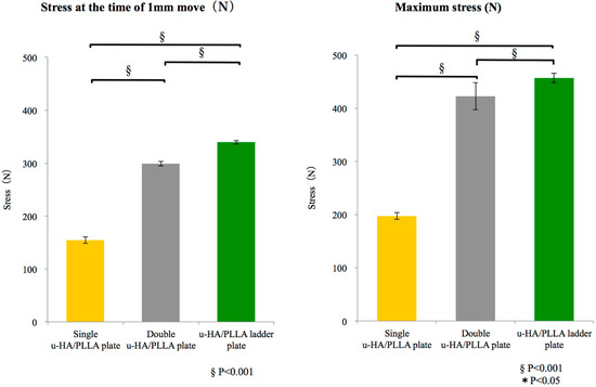 There was a significant difference among groups, as well as between the single u-HA/PLLA plate and double u-HA/PLLA plate groups and between the double u-HA/PLLA plate and u-HA/PLLA ladder plate groups. In particular, the u-HA/PLLA ladder plate group was significant regarding stress at the time of 1-mm movement and the maximum stress (Figure 4).