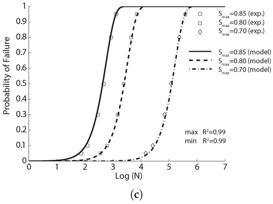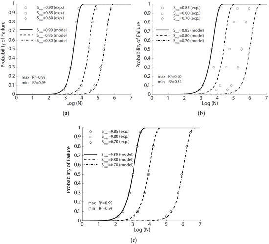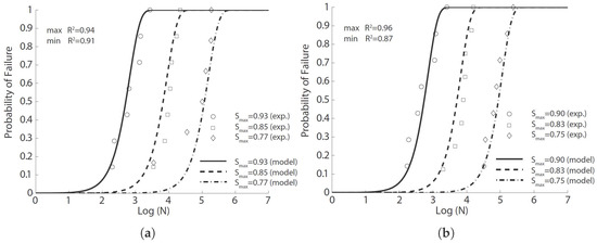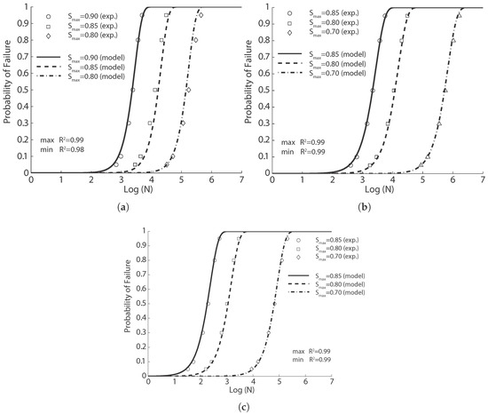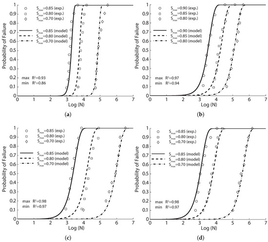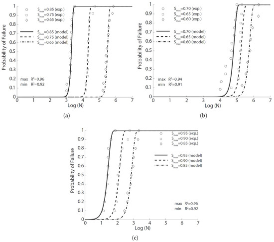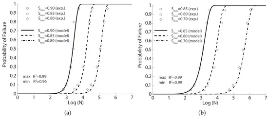 The fatigue tests were performed at a loading frequency of 20 Hz. Three stress levels, all with the same stress ratio of 0.1, were used for each concrete. The authors fitted their fatigue data with a two-parameter Weibull model for each stress level with correlation coefficients exceeding 0.90. We adopt Equation (8) herein to get a single fitting for the fatigue tests carried out at three different stress levels, the corresponding results of which are given in Figure 7 and Figure 8 for long (50 mm) and short (25 mm) fibers, respectively. Taking into account the fact that the model parameters for the same material had to be the same, the correlation is excellent.