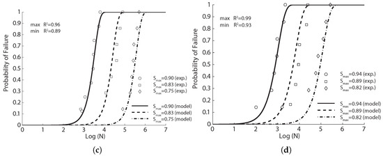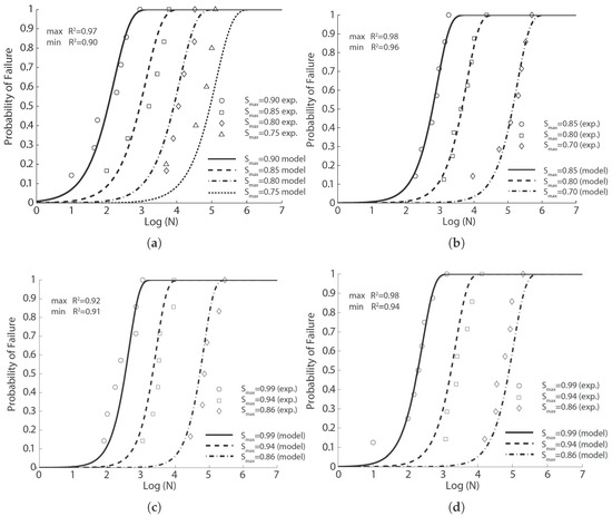 Comparison of the flexural fatigue data of Mohammadi and Kaushik [17] with the fitted probabilistic model Equation (8) for concrete reinforced with fibers of 50 mm in length and volume ratios of (a) 0%; (b) 1%; (c) 1.5% and (d) 2%.