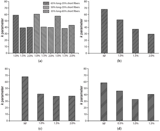 As mentioned previously, the shape parameter, k, is higher for the control concrete due to the fact that the addition of fibers may modify the concrete matrix by creating more voids around the fibers, and consequently, the scattering on the fatigue life increases. This effect results in lower k values when the fibers are added. From Figure 15a, it may be observed that the reduction of k due to fiber addition has a stronger correlation with for long fibers and a weaker correlation for short ones. This can be attributed to the easier workability of short fibers. In other words, a more uniform fiber distribution is achieved during the mixing process when shorter fibers are added.