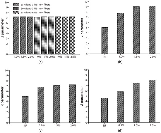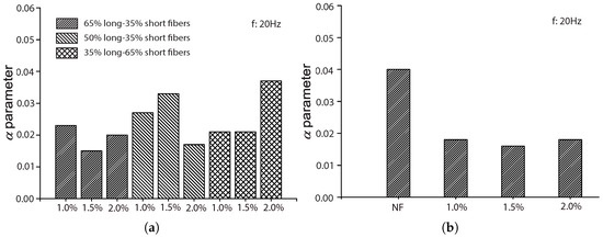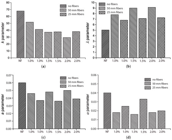 Figure 15c shows that parameter a decreases upon fiber addition. This diminution is more evident for short fibers. Specifically, for 1.0% of the volume fraction of short fibers, a is 43% less than that of plain concrete; for 1.0% of long fibers, a is 20% less than that of the control concrete.