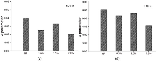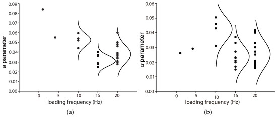 The influence of the loading frequency on the compressive fatigue life of plain and reinforced concrete at low loading rates has been demonstrated by the experimental work of Ruiz et al. [8] and Medeiros et al. [9]. This influence is accounted for by the a and parameters in Equation (8) by Saucedo et al. [27]. Figure 16 presents the values for these two parameters for flexural fatigue tests carried out at different loading frequencies for both plain and fiber-reinforced concrete. Note that there is a descending trend for a until 15 Hz. For , a similar trend is observed for loading frequencies between 10 and 15 Hz. Since very few data are available for lower loading frequencies, it is difficult to reach a definitive conclusion.