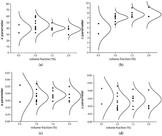 As mentioned previously, among the four parameters (), a smaller k represents a wider scattering; a larger corresponds to stronger material strength (in the case of bending, is approximately 95% of the flexural resistance, ). The exponent represents the dynamic amplification of the material strength, whereas a reflects the influence of loading frequency, when the others do not change. In other words, both and can be considered material properties, whereas k indicates that the static properties are distributive in more or less extension. In this section, we analyze the results obtained in Section 3; specifically, we focus on the influences of the fiber volume ratio , fiber length, and loading frequency, f. It should be emphasized that, due to the probabilistic model Equation (8), we are able to analyze and interpret vast experimental data through model parameters in a more organized manner.