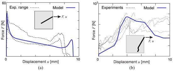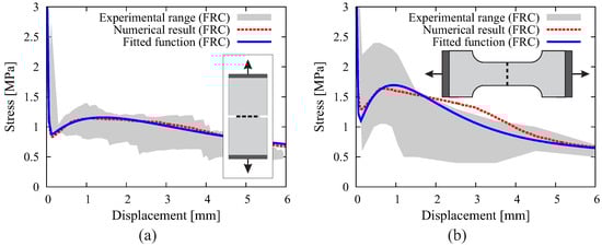 where , , and are coefficients determined from a least-square curve fitting to the original numerical evaluation of Equation (1); is a reference value of crack opening; represents the ultimate crack opening; and is the tensile strength of the FRC composite. This function form can be easily used to represent traction-separation laws for different fiber-concrete composites (Figure 2c). Figure 3 contains the validation examples demonstrating the quality of the model in describing the bridging effect of fibers across the horizontal crack in a notched FRC prism cast in a “standing” mold [] and the vertical crack in a “dog bone” specimen cast in a “lying” mold [].