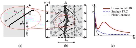 Crack bridging model: (a) position and inclination of a fiber with respect to the crack; (b) unit area of an opening crack in FRC intercepted by fibers with length ; (c) sketch of the obtained traction-separation relations for different FRC composites.