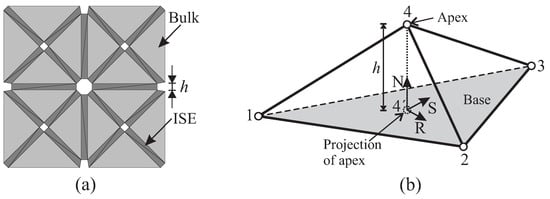(a) Processed mesh for computation, obtained after the insertion of solid elements into all interfacial gaps; (b) degenerated 3D solid element characterized by the “base”, the “apex” Node 4 and its projection on the base (Point 4’). ISE, interface solid element.