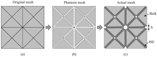 As illustrated in Figure 7, in a first step, the topology of the original finite element mesh is investigated. Based on the topological information (e.g., the neighboring bulk elements, the common edges and the node connectivity), the original mesh is fragmented. All common edges are duplicated; every bulk element shrinks via offsetting the edges by ; a “phantom mesh” is obtained (Figure 7b). Afterwards, every gap between the neighboring bulk elements is filled with solid elements characterized by a very high aspect ratio (Figure 7c), resulting in the actual discretization of the domain used for the computation. It is worth emphasizing that three-node-triangular (in 2D analyses) and four-node-tetrahedral (in 3D) are used both for bulk and interface elements.