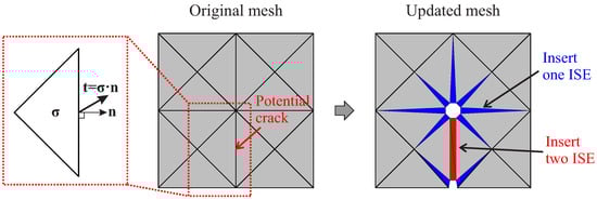 It should be noted that also other criteria based on, e.g., linear fracture mechanics, are alternatively used in the literature []. The factor controls the level of threshold and is generally set as 0.8, according to the authors’ experience. Setting a small value of , too many unnecessary interfaces may be identified as critical and too many ISEs may be generated. On the other hand, a large value () may lead to the over-stressing of interfaces, since the ISE should be prepared prior to the crack initiation. With the tolerance, the value of 0.8 includes a banded region along the crack path. Consequently, the influence of the insufficient accuracy of the resolution of the stress field at the crack tip inherently obtained from using linear finite elements is eliminated.