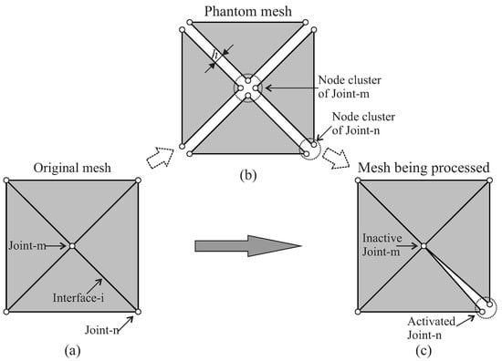 As illustrated in Figure 7, the “phantom mesh” is generated before starting the structural analysis. This process is identical for both full and adaptive insertion options. The difference lies in the subsequent steps: For the full insertion, the phantom mesh is directly used as the basis, and subsequently, solid elements are generated by correctly connecting the nodes on the two sides of the interface. However, in the adaptive algorithm, the phantom mesh provides a collection of topological information that is only partially used during simulation. As depicted in Figure 9a for a 2D configuration, every “joint” (such as joint-m or joint-n) corresponds to a node in the original mesh, and an “interface” (e.g., interface-i) connects two joints. In the phantom mesh (Figure 9b), every joint controls a cluster of phantom nodes. During the loading procedure, whenever a joint is activated, the original node (e.g., node-n) is replaced by the corresponding cluster of phantom nodes (Figure 9c).