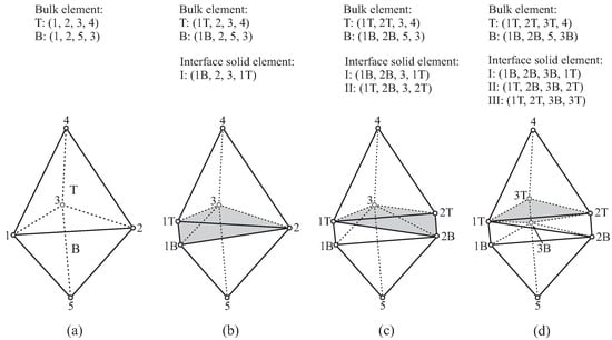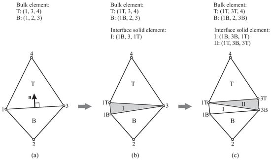 - Initially, the interface connecting Node-1 and Node-3 is shared by two bulk elements, i.e., Element-T and Element-B. (For convenience, Element-T refers to the bulk element located on the positive side of the interface, and Element-B is on the other side; see Figure 10a).
