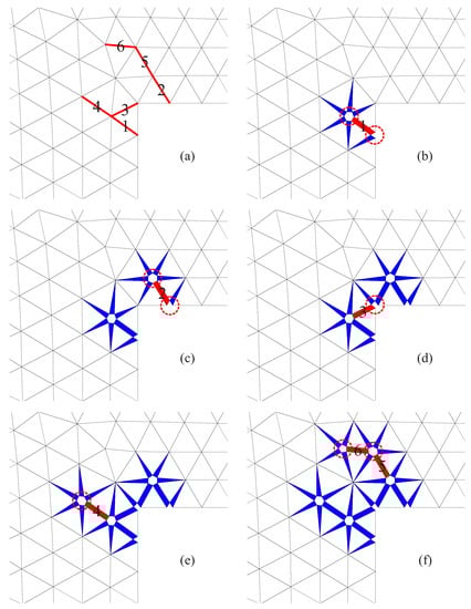 Note that the procedure described above is not limited to the processing of a critical interface within one load increment. In general, there are three possible situations for the opening of a 2D interface; the other two cases are as follows: (1) An interface is partially open due to the activation of an adjacent interface; this process can be graphically represented by Figure 10a,b. (2) After a certain number of load increments, a partially split interface (Figure 10b) becomes fully separated (Figure 10c), because the interface itself or a neighboring interface reaches the critical state (as will be illustrated in the numerical examples contained in Section 4).