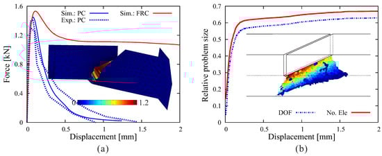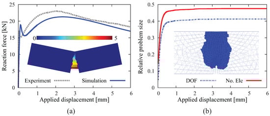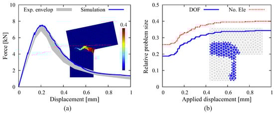 Results of a 3D simulation of the fiber-reinforced notched beam test: (a) comparison of load-displacement curves obtained from the adaptive finite element analysis and from the experiment [] and crack pattern; (b) evolution of the relative problem sizes in terms of the number of degrees of freedom and elements, respectively, and generated ISEs at the end of simulation ( 6 mm).