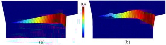 Referring to the diagram in Figure 14b, the reduction factor can be graphically understood as the ratio of the area under the curve to the full area (with the height = 1), which gives and . From the documented results, it becomes clear that a significant reduction of the total computational cost is achieved when using the proposed adaptive ISE insertion strategy as compared to inserting interface elements a priori in the entire mesh.