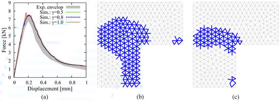 Results of the 2D simulation of “L-shape” test using the proposed adaptive crack model: (a) comparison between the structural responses obtained from the simulations with different values of ; (b) all of the created interface solid elements (blue lines) for the case of ; (c) all of the created interface solid elements (blue lines) for the case of .
