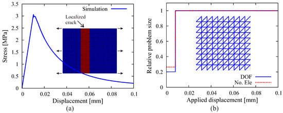 Results of the 2D simulation of uniaxial tension on a square specimen: (a) computed structural responses and crack pattern; (b) evolution of the relative problem sizes regarding the system degree of freedom and number of elements, as well as all of the created interface solid elements (blue lines in the mesh).