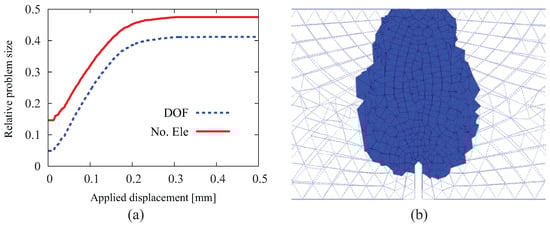 By employing the adaptive insertion technique, simulation results are obtained without any noticeable difference. However, the computation starts with the original mesh with interface solid elements being first inserted in the vicinity of the notch-tip and then continuously added in the vicinity of the front of the macroscopic crack, which propagates vertically into the beam until the structure fails. At the end of simulation ( mm), only 77,538 ISEs are created and distributed along the structural crack (Figure 19b). As compared to the case of full insertion, the efficiency of adaptive insertion is clearly seen in Figure 19a. At the beginning, only of the system degrees of freedom (DOF) and of the number of elements are used for the computation; these values increase with the loading procedure. When the structural crack approaches the top surface ( 0.3 mm), the insertion of new ISEs in every load step becomes negligible, and the problem size remains more or less constant at the level of approximately in regard to the system DOFs and in regard to the number of elements. As a general assessment, the reduction factors are evaluated according to Equation (15) as and (identical to ).