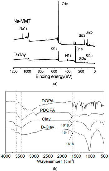 (a) XPS spectra of MMT clay and D-clay; and (b) FTIR spectra of MMT clay, D-clay, DOPA and PDOPA.