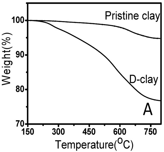 X-ray photoelectron spectroscopy (XPS) measurement was carried out using a Kratos Analytical AXIS HIS spectrometer (Shimadzu Corporation, Kyoto, Japan) with a monochromatized Al Ka X-ray source (1486.6 eV photons) to verify the polydopamine coating on the clay. Thermogravimetric analysis (TGA) was carried out using a TGA Q2950 (TA Instruments, New Castle, DE, USA) under an atmosphere environment where the samples were heated from 25 °C to 140 °C and kept isothermally for 40 min before being further heated at a rate of 10 °C/min to 850 °C. Fourier transform infrared spectroscopy (FTIR) was carried out using a Perkin-Elmer 2000 spectrometer (Perkin-Elmer, Waltham, MA, USA) scanning in the range of 400 cm−1 to 4000 cm−1 with a resolution of 4 cm−1. Crystal structure was determined using X-ray diffraction (XRD) on a PANalytical X’Pert PRO X-ray diffractometer (Almelo, The Netherlands) with Cu K radiation (λ = 0.154 nm). D-clay was pounded and grinded into powder form before the XRD measurement. Samples were scanned with a scanning rate of 2°/min from 2° to 35° in ambience. The average D-spacing was then calculated using the Bragg’s law based on the measured diffraction angle.