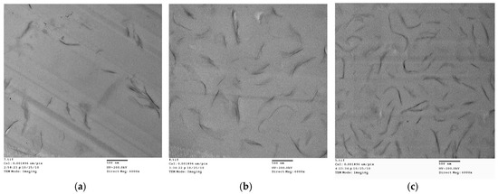 TEM micrographs of the D-clay epoxy at different weight loading. (a) 1 wt %; (b) 2 wt %; and (c) 5 wt %. The scale bar represents 500 nm in all figures.