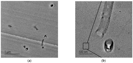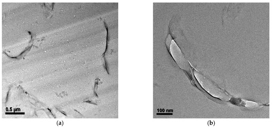 After the epoxy resin was cured with the amine hardener, the peak at 2θ = 3.8° weakened significantly. This result shows that during curing, intercalation of D-clay has taken place. This extent of intercalation could lead to great improvement in both mechanical and physical properties of the polymer clay composite [24,25,26,27]. Transmission electron microscope (TEM) images taken from the cured D-clay epoxy nanocomposites show that the D-clay are in the form of thin tactoids formed by a few layers and randomly distributed throughout the epoxy matrix (Figure 5). The thickness of such tactoids is about 10 nm and the length to thickness ratio in the range of around 50. At the same time, completely exfoliated single layers can also be observed in the area near the tactoids. It is, therefore, concluded that the PDOPA coating on the MMT greatly benefits the intercalation and exfoliation of D-clay within the epoxy matrix because of the strong interaction between PDOPA and epoxy matrix to give a higher magnitude of intercalation and partial exfoliation of the D-clay within the epoxy matrix.