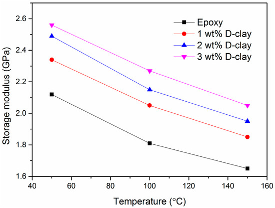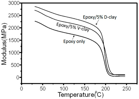 Figure 8 shows that the storage modulus of D-clay composite is higher than that of untreated virgin clay (V-clay) composite, while the epoxy without filler is even lower than the V-clay composite. The comparison indicates that the interfacial interactions, and thereby storage moduli, are indeed enhanced by the DOPA treatment.