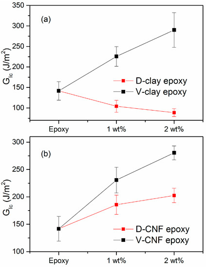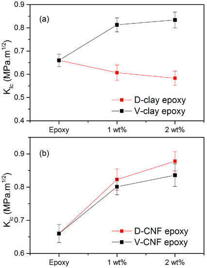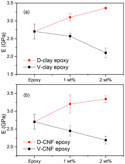 As shown in Figure 9a, there is an increase of ~13% in Young’s modulus of the composites with 1 wt % addition of D-clay. At 2 wt %, the increase is ~25%. From previous XRD results and TEM observations, D-clays are intercalated within the epoxy matrix with some of the clay layer completely exfoliated in the epoxy matrix. This illustrates that this state of dispersion helps in improving the stiffness of D-clay epoxy nanocomposites. In contrast, the Young’s modulus of epoxy V-clay composites dropped by about 24% with addition of 2 wt % V-clay.