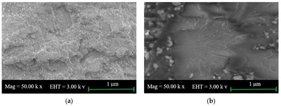 The morphologies of the PU surface and starch powder are shown in Figure 1a,b, respectively. The neat PU sample was prepared by dropping a small mass of PU on a cleaned glass surface while the starch powder was spread over another glass surface. Both surfaces are smooth and do not show noticeable irregularities, in agreement with other previous studies [,].