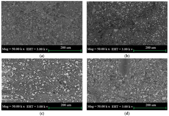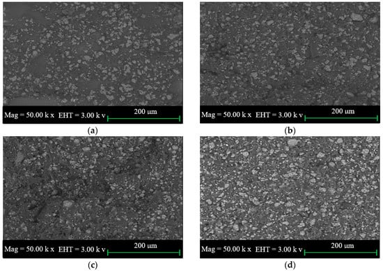 The SEM images of the tensile fractured surface of PUS composites at different starch loadings are shown in Figure 2a–d. The fractured surfaces show the presence of starch which is represented by white dots distributed over the PU surface. As the starch percentage loading increases, the density of the white dots and, to a lesser extent the size, increase. The increase in the size suggests the formation of agglomeration which has a significant effect on the physio-mechanical properties of the composites. The fractured tensile surface at 0.5 wt.% starch (Figure 2a) does not show clear cracks in the fractured surface. The crack in the surface becomes very clear as the starch loading increases from 1.0 to 2.0 wt.% starch as shown in Figure 2b–d. SEM images shown in Figure 2 suggest that the tensile strength increases and then decreases due to the formation of the cracks which confirms the dependency between the tensile strength and the agglomeration of starch in PU matrix.