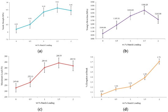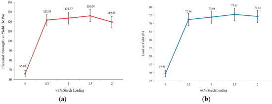 The maximum load at the yield of the neat PU and PUS composites is shown in Figure 5b. The maximum yield is defined as the stress where the material begins to deform plastically. Basically, this test is closely related to the elasticity of the material without considering the rigidity. It intends to determine the limits of the performance for mechanical components before partial or total deformation could occur. The maximum load at yield tests help in reshaping the material and explores how susceptible the material is to cutting or shearing. The neat PU sample shows that a load of 39.49 N is enough to deform it, while the PU-1.5 wt.% starch needs 75.63 N to achieve the same level of deformation. Based on this assessment, the PUS at 1.5 wt.% loading shows an increase of 91%, which agrees with the result obtained for the flexural test. The overall results of the maximum load at the yield show clearly that the PU sample is vulnerable to any outside influence such as pressure or loading. The result also shows that even at a loading of 2.0 wt.% of starch, the PUS composite still shows very good elasticity as the yield increases by about 88% compared to the neat PU [].