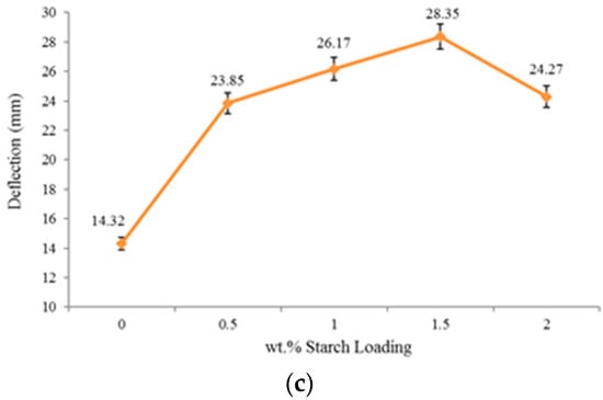 Figure 5c shows the deflection caused by a certain load applied on the neat PU and PUS composites. The neat PU can sustain deflection up to only 14.32 mm. As the starch percentage loading to PU increases, the deflection increases by showing better elasticity until 1.5 wt.% at which point the sample shows 28.35 mm deflection. The result here is divergent from other consistent findings of the mechanical measurements discussed earlier, and shown in Figure 4, as 1.0 wt.% starch exhibits the maximum or the critical property instead of 1.5% starch loading. The diversion of the deflection measurement could be attributed to either an experimental error, or more likely, to very similar results between the 1.0 and 1.5 wt.% starch in previous results. The elasticity is improved, based on the neat PU, by about 98%, while the maximum loading of 2.0 wt.% starch shows only 69% improvement. In the shadow of the results here and other mechanical measurements, it is important to add at least one test between 1.5 and 2.0 wt.% starch to a better localize the critical values of the mechanical properties.