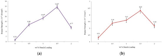 The effect of notching the sample could be used to show that the smoothness of the sample surfaces plays an important role in the impact strength []. The results show that the maximum impact strength which occurs at starch loading of 1.5 wt.%, declines by a significant amount of 103%. This significant decrease is marked in science and engineering as a phenomenon that deserves to be highlighted and studied thoroughly.