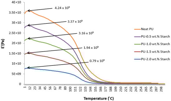 Figure 7 shows the storage modulus of neat PU and PUS composites as a function of temperature. All materials show maximum storage ability at about 15 °C, after which the storage modulus is fading out exponentially. The results suggest that the neat PU has the best storage modulus ability which decreases as starch content increases from 0.5 to 2.0 wt.%. The results also show that the highest temperature at which can be tested for neat PU appears at about 180 °C or lower, while the maximum temperature of PU-2.0 wt.% starch is shifted to a lower temperature of 140 °C.