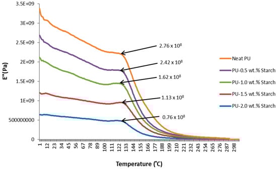 The loss modulus () curves obtained from the DMA instrument for neat PU and PUS composites are shown in Figure 8. The loss modulus curves show that neat PU crystallizes at 124 °C, while PU with the addition of 0.5 wt.% of starch crystallizes at 127 °C. This is indicative that adding a small amount of starch could shift the crystallization temperature (Tc) of PU. Adding starch to a PU matrix enhances the nucleation process of PU crystallization by increasing the surface area of the PUS and providing more nucleation sites for the PU to crystallize.