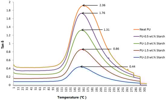 Figure 9 shows the loss tangent (), which is defined as the ratio of () of neat PU or PUS composites. The loss tangent is used to measure the melting temperature (Tm). The results show that Tm shifts from 156 to 150 °C for PU-2.0 wt.% starch.