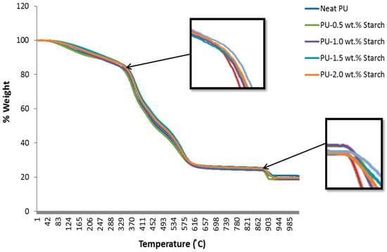 The TGA curves for neat PU and PUS composites at different loadings are shown in Figure 10. For the PUS, the whole degradation steps can be observed from about 35 to 1000 °C. Generally, the weight loss of the various loadings of PUS composites does not show a significant difference, suggesting that adding small starch quantities to PU has almost no serious influence on the water contained in the matrix. The results show four major regions of the weight loss: between 35 and 360 °C, between 360 and 570 °C, between 570 and 900 °C, and finally between 900 and 1000 °C. The rate of the weight loss in these four regions is: 16%, 52%, 8%, and 5%, respectively. The highest weight-loss rate appears in the second region of 360 and 570 °C. The results also show that minimum weight loss appears in the last region between 900 and 1000 °C. Overall, the PUS composites up to 2.0 wt.% starch do not show a significant difference, which suggests that the elasticity gained for the nanocomposites has almost no effect on the water contained in the matrix.