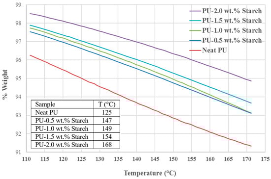 The degradation at is a scale used to compare the behavior of samples at 5% weight loss due to heating, as pointed out by []. Figure 11 and the insert show the temperatures at which PU and PUS composites lose 5% weight. As the starch contents increases, the temperature required to achieve 5% weight-loss increases from 125 °C for neat PU to 168 °C for PU-2 wt.% starch. The increase in temperature reflects the effect of the starch as an additive to PU which makes PU more resistive to increasing temperature or more stable construction.