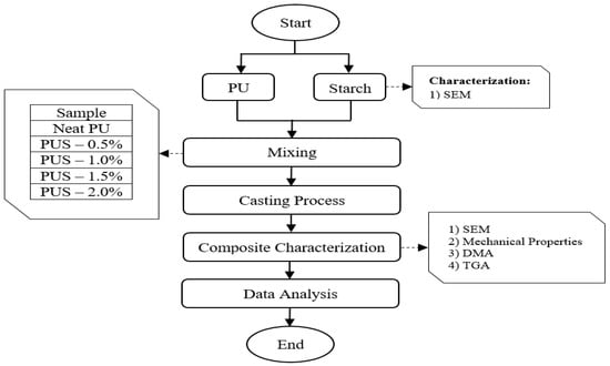 The sample preparation and the experimental procedures were conducted according to the flow chart shown in Figure 12. The imported thermostat PU was taken and mixed at weight percentage with the natural starch at 0.5, 1.0, 1.5, and 2.0-weight percentage. The mixture of PU and starch (PUS) of each sample was manually mixed (casting) and with the aid of heat formation during the mixing process, homogeneous solutions were obtained. In addition to the neat PU sample, four samples were prepared by loading starch with PU at 0.5, 1.0, 1.5 and 2.0 wt.%. These samples (composites) are named as PUS-0.5%, PUS-1.0%, PUS-1.5%, and PUS-2.0%.
