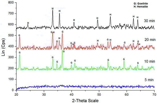 Goethite can be prepared in the laboratory in various ways such as oxidation of ferrous solution [], precipitation of ferric solution [], or thermal transformation []. In the conventional preparation, the reaction time is often long from 24 h to several days and goethite particles are often in a range of several micrometers and have a low surface area []. Some contributions [,,] revealed that when in the nanoscale, goethite particles show the high surface area and effective adsorption ability. To obtain the goethite nanoparticles, surfactants were used as the template to control the shape and size of the materials [,], although the process still takes a long time. The usage of microwaves to support the synthesis of nanomaterials in order to reduce the time and increase specific properties has been investigated in numerous papers [,,,,,,] which suggested the ability to significantly reduce the reaction time as well as the size of the particles.