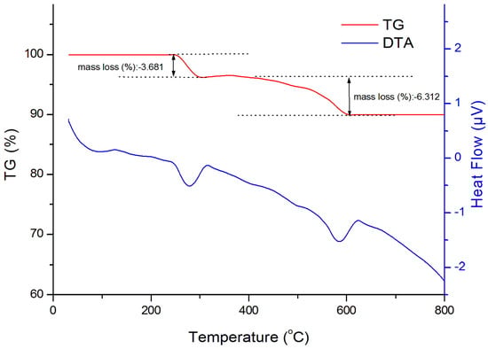 Figure 3 presents the thermal gravimetric analysis (TGA) and the differential thermal analysis (DTA) curves. From room temperature to 800 °C, there are two endothermic peaks in the ranges from 250 to 320 °C and from 550 to 620 °C on the DTA curve, respectively, corresponding to two weight loss effects on the DTA curve []. The reason for this can be the thermal decomposition of the goethite phase to form the hematite phase. The total weight loss is 9.99% while this value theoretically calculated is 10.12%, implying that the obtained powder is nearly pure α-FeOOH.