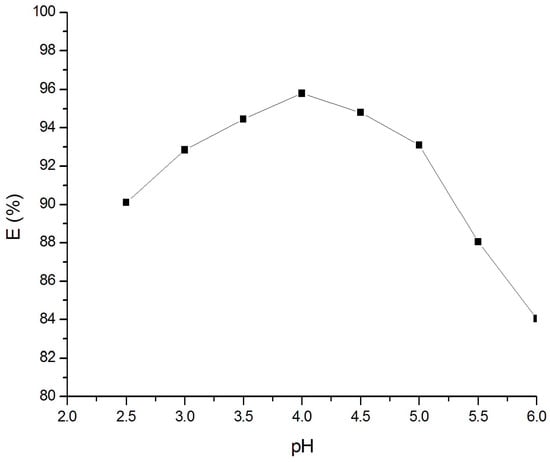 To find out the optimum pH for Cr(VI) adsorption on goethite, experiments were carried out at different pH values, from 2.5 to 6.0 with the Cr(VI) concentration of 80 µM in 600 min. The results (Figure 4) indicate a noticeable effect of pH on the adsorption of Cr(VI) on goethite. Namely, the removal efficiency of Cr(VI) increases from 90.10% to 95.80% when increasing the pH from 2.5 to 4.0 and then decreases when the pH is above 4.0.