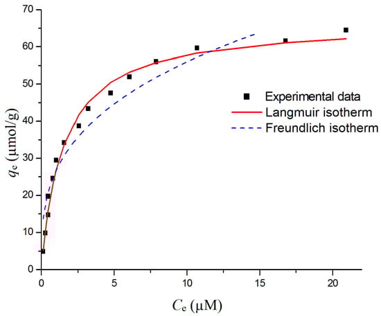 Initial concentration and the maximum capacity of adsorption are important parameters for Cr(VI) removal. In order to predict the adsorption trend and the maximum amount of Cr(VI) sorbed on goethite, the adsorption experiments have been carried out with different initial concentrations of Cr(VI) at a pH of 4.0 and for 540 min and the results were fitted to the Langmuir and Freundlich models (using OriginLab software, 9.0, OriginLab Corporation, Northampton, MA, USA). Results were presented in Figure 6 and Table 2.