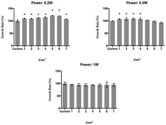 Growth rate (%) of human epithelial fibroblasts at 24 h post-irradiation with a 940 nm diode laser in continuous mode with different energy density (1, 2, 3, 4, 5, 6, and 7 J/cm2) and power (0.2, 0.5, and 1 watts) doses. * p < 0.05.